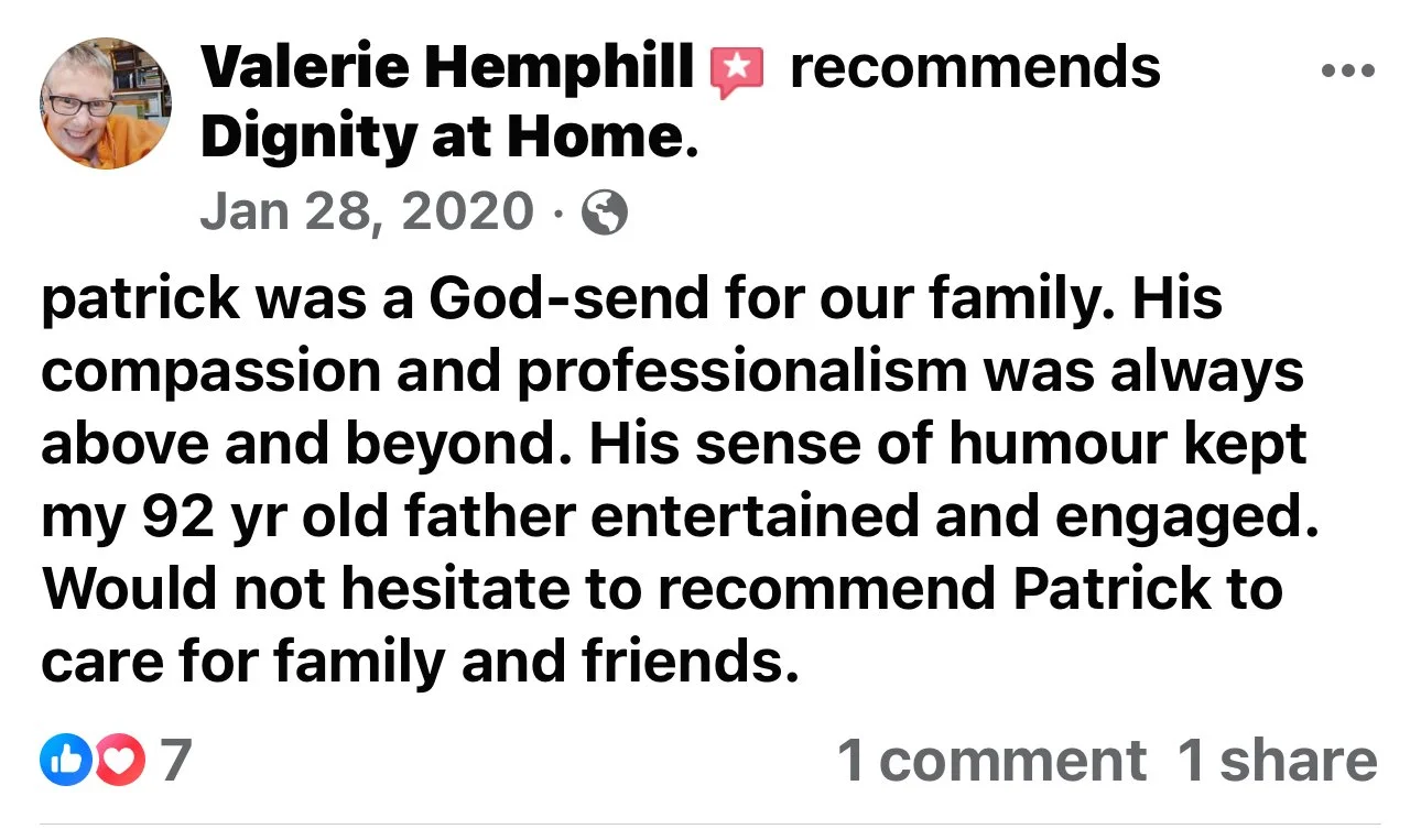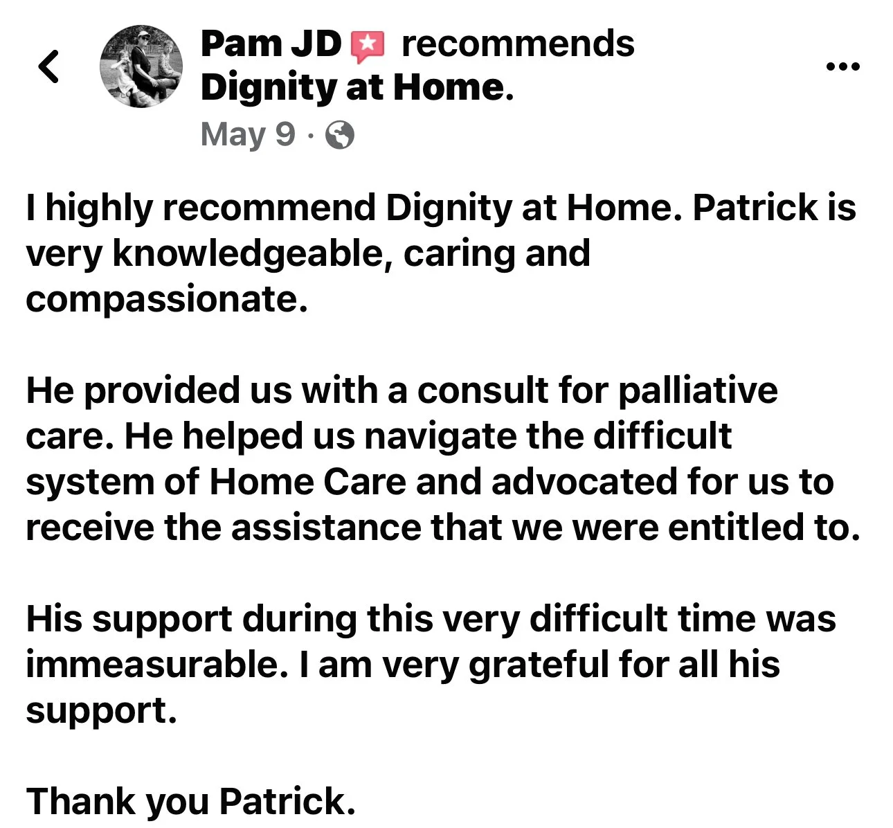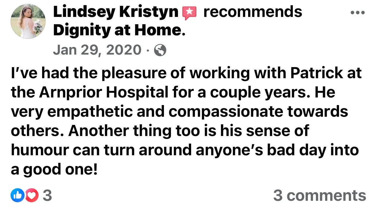 I founded Dignity at Home in June of 2018 in Ottawa Canada. I had come to the end of my rope in Ontario's overburdened and underfunded healthcare system while watching patients fall through the cracks. I decided to change what I was doing so that I could give care on my own, terms which incorporated three lifelong passions of mine (Cooking, Caregiving, and Humour.)